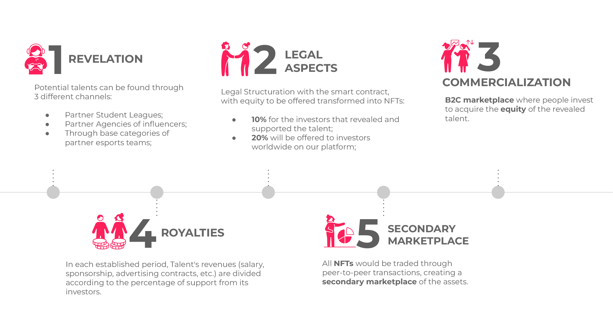 The user journey is an exploration from the initial contact, where players seek recognition and fans connect with their idols, to where investors, whether experienced or newcomers, find promising opportunities. This extends to post-sale and acquisition management, providing a comprehensive and dynamic experience."