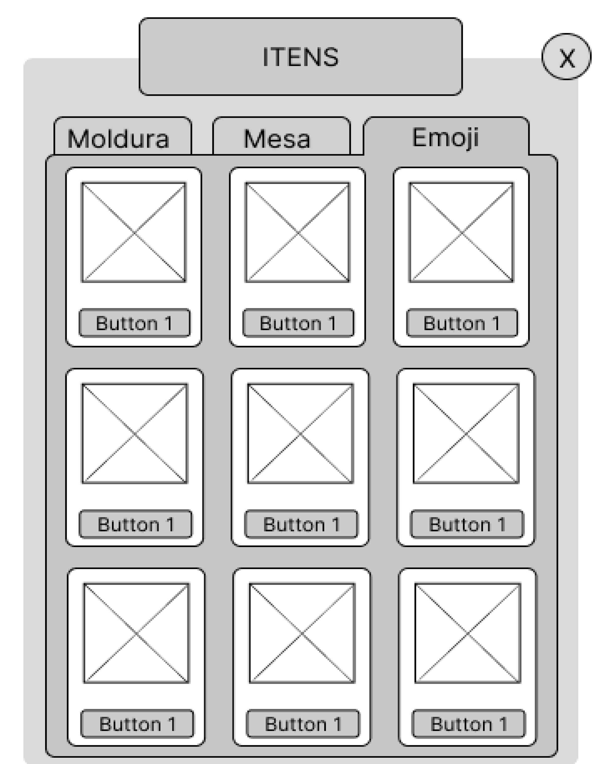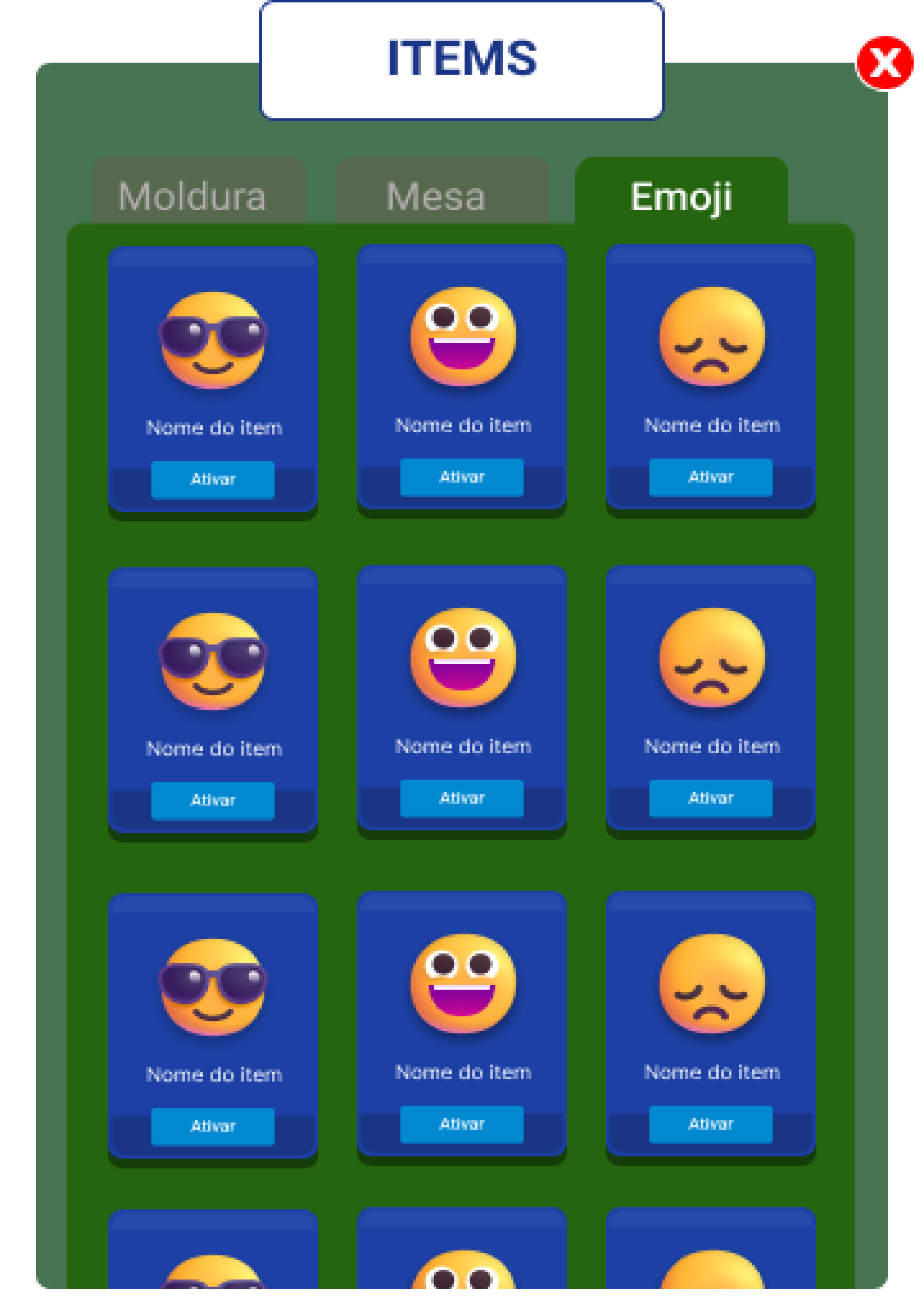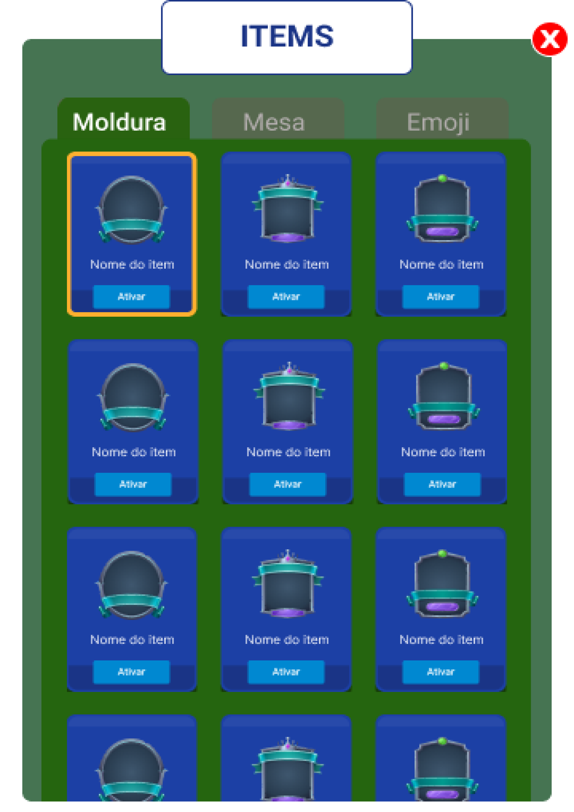 - Categoria de itens destacada no topo (Molduras, Emojis, Mesas).